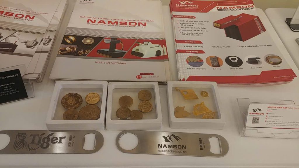 Bên cạnh đó, gian hàng của Nam Sơn Laser tại khu vực triển lãm thu hút sự chú ý của đông đảo khách tham quan nhờ bộ sưu tập các sản phẩm công nghệ laser đã được sản xuất hoàn thiện, trưng bày trực quan và sinh động, thể hiện rõ năng lực vượt trội của doanh nghiệp trong lĩnh vực cắt, khắc và hàn laser công nghiệp.