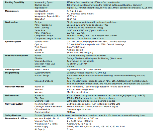 The GAR1200L is an in-line router machine specially designed to route (depanelize) large panels with PCB sizes up to 450 mm x 310 mm into individual units. It is a fast, space-saving, and accurate machine designed for high-volume production with minimal operator participation. The superior servo axis system provides a high acceleration/deceleration, reducing cycle time (increase in production output) and, at the same time, maintaining high accuracy cutting.