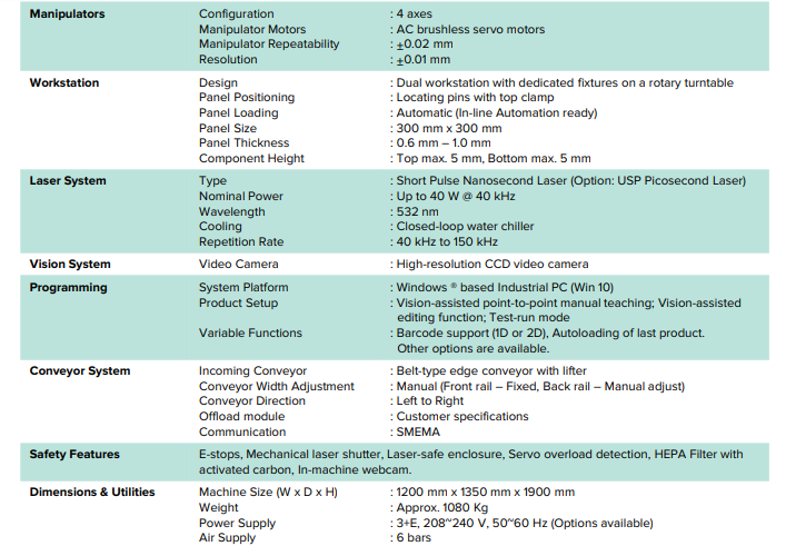 The system consists of up to 4 high-speed vacuum suction nozzle tips for very low dwell time pick-and-place operations to boost productivity. The machine also supports barcodes and 2D codes verification of incoming boards before depaneling and sorting outgoing boards before releasing them to downstream processes or straight to tape-and-reel packaging.
