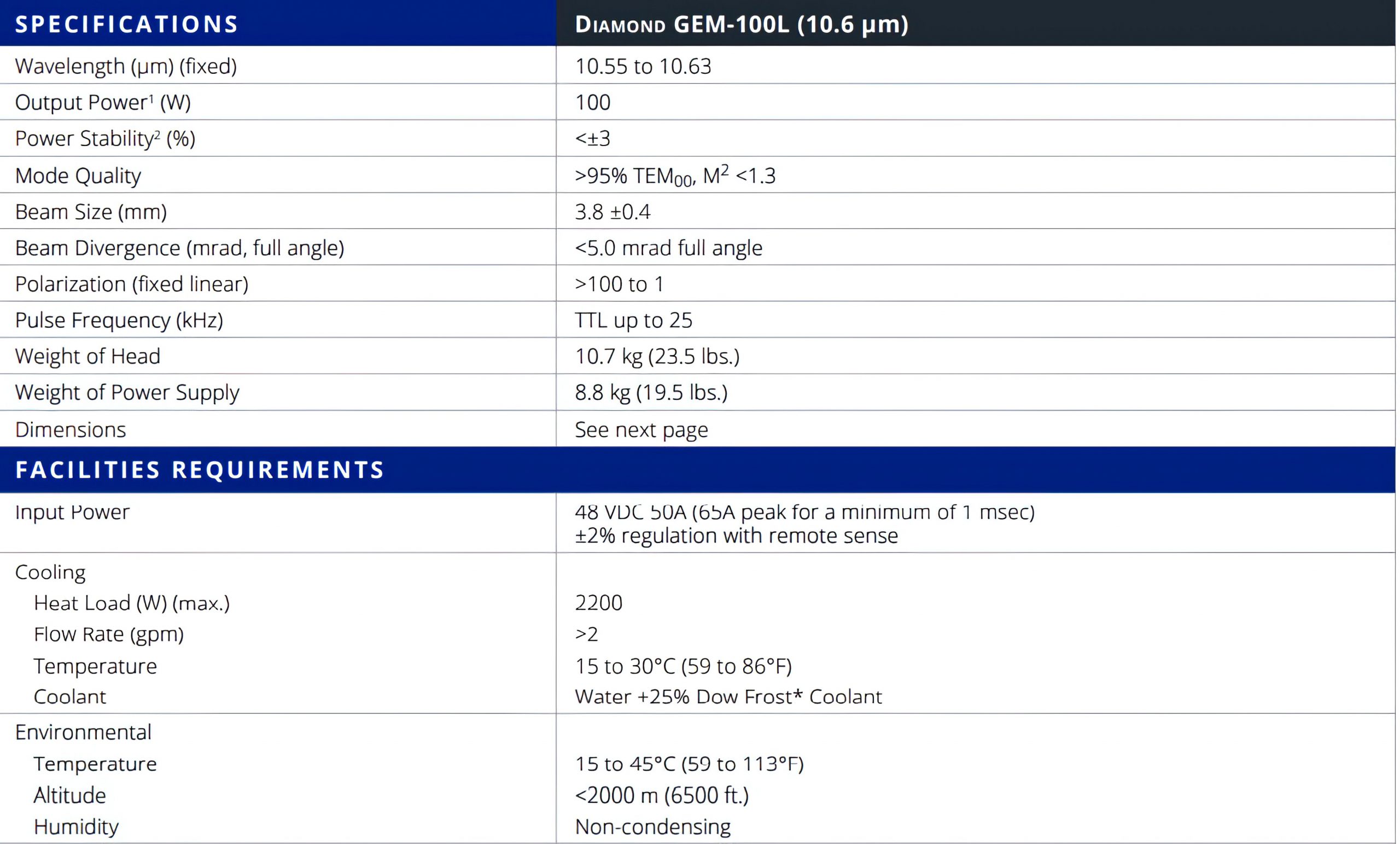 DIAMOND GEM-100 CO2 lasers are available as air- or water-cooled units and are delivered with a separate RF power supply. Overall, the GEM-100 low-power lasers deliver exceptional value, performance and reliability.