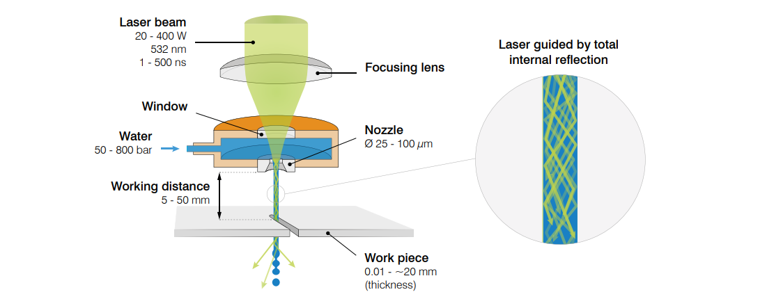 The Laser MicroJet® is a hybrid method of machining, which combines a laser with a “hair-thin” water jet that precisely guides the laser beam by means of total internal reflection in a manner similar to conventional optical fibers. The water jet continually cools the cutting zone and efficiently removes debris.