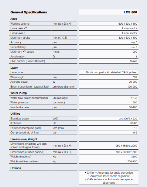 The LCS 800 has an intuitive and fully integrated system control interface with touchscreen functionality. The offset calibration system integrates automatic laser-nozzle alignment, automatic jet angle correction (both optional) and laser power control