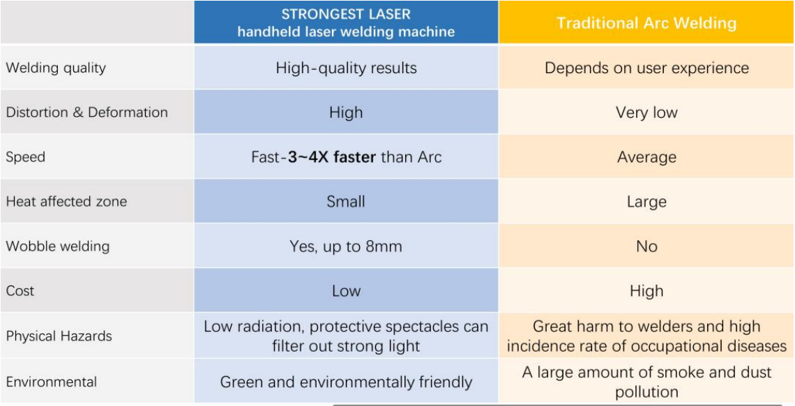 STRONGEST LASER Compared with MIG or TIG, STRONGEST LASER is based on the company’s independently developed “small core diameter” laser technology, adopts a new dualcircuit refrigerant direct cooling system and an integrated structure design, providing customers with higher efficiency, higher melting depth, higher energy saving and more convenient experience. |