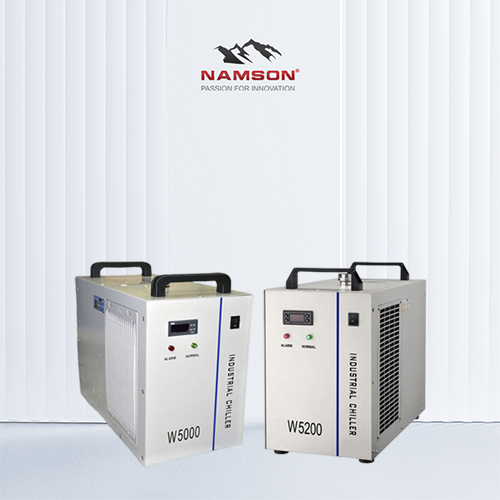 Máy làm lạnh công nghiệp W5100-5200 dung tích 1400W, được ứng dụng để hạ nhiệt phát ra từ máy laser trong quá trình hoạt động nhờ vào chu trình làm lạnh của hệ thống máy nén.