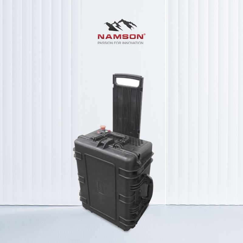 Nguồn laser và bộ điều khiển được đặt trong một hộp kín chắc chắn để bảo vệ tối ưu khỏi môi trường khắc nghiệt và cường độ di chuyển cao. Chùm tia laser được truyền trực tiếp tới đầu làm sạch bằng dây cáp. Đầu làm sạch có chứa một bộ gương để quét chùm tia và một thấu kính hội tụ để tác động ánh sáng lên bề mặt làm việc. Hệ thống quang học chống phản xạ được tích hợp vào đầu làm sạch để tránh làm hỏng nguồn laser. Tia đỏ dẫn hướng được thiết kế cho mục đích xác định chính xác mục tiêu cần làm sạch. Máy được làm mát bằng không khí, khép kín, cầm tay và di động.
